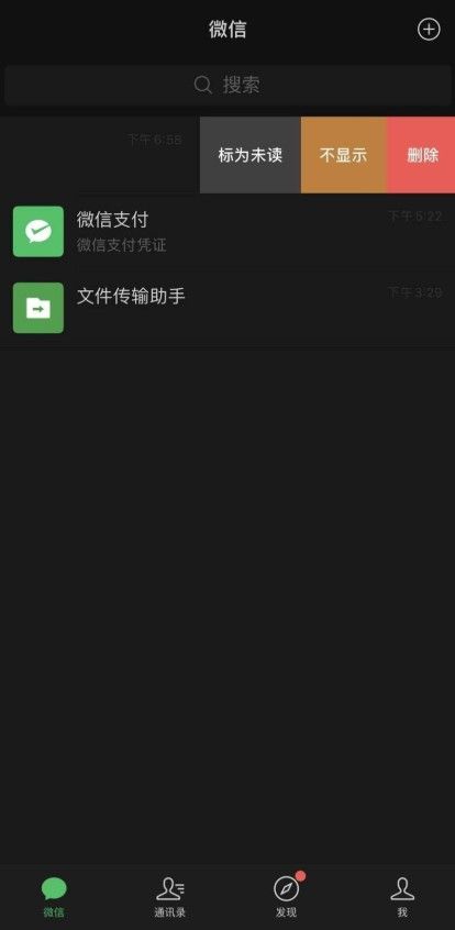 在微信7.0.16 for iOS测试版中,聊天会话除了可以执行“标记为已读/未读”、“删除”之外,还有了“不显示”这个操作选项。
