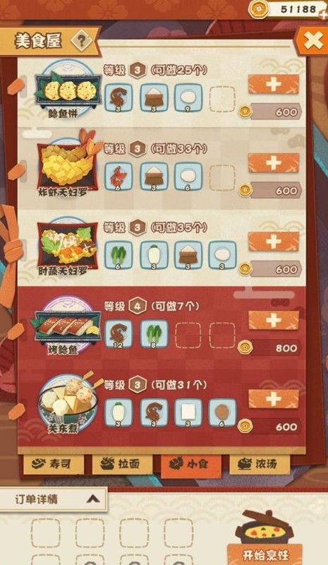 在通过关卡1-3后,就可以清扫落叶开启美食屋了。想要制作美食,需要选择一个搬菜员,再点击小纸人选择制作菜品,调整好想要制作的数量,点击“开始烹饪”按钮,支付金币后,纸人厨师就开始制作美食了。需要特别注意的是,没有搬菜员,小纸人大厨是不会干活的,大家需要密切关注搬菜式神的心情,若是式神心情归0直接不干活了,就没法做菜啦。