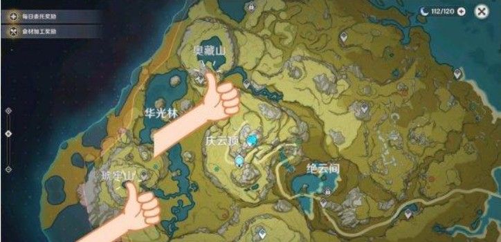 打开地图发现就在三座山的山顶,简直靠了,跑图到这个地方来就一直在爬山。图中是另外两个地方,起初那个就在开石像路上,这个可以直接从第二张图也就是庆云顶直接飞过去,记得庆云顶的小传送点亮,方便最后回来