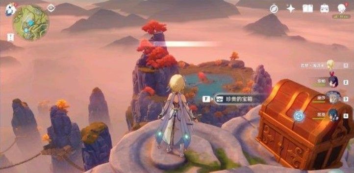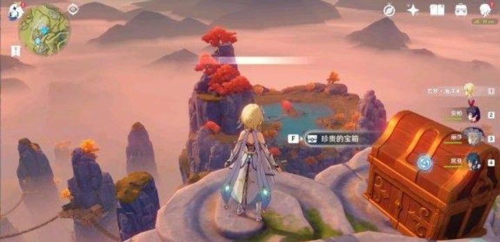最最最后,在分享一个跑图中碰到的金箱子。也是无聊爬山,这座山比庆云顶那些山要难爬一点。同样旁边有一个喂神像的,就是一图左边的风柱,用火元素攻击柱子,产生风柱,自然升空就可以吃到,吃完正好飞到箱子上