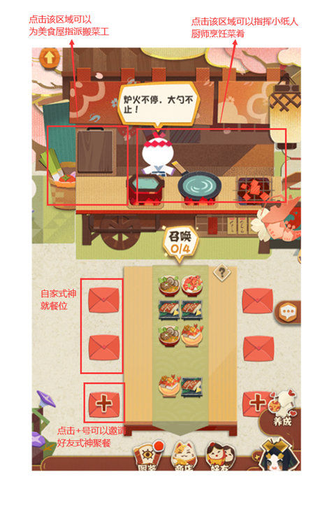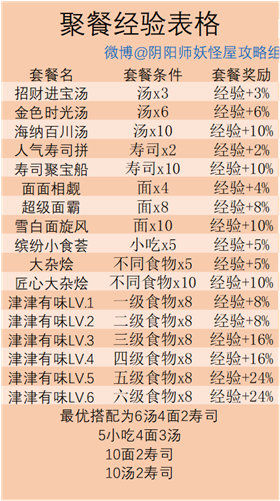 美食屋聚餐是妖怪屋里重要的经验来源,在聚餐时也可以获得少量的勾玉和金币。