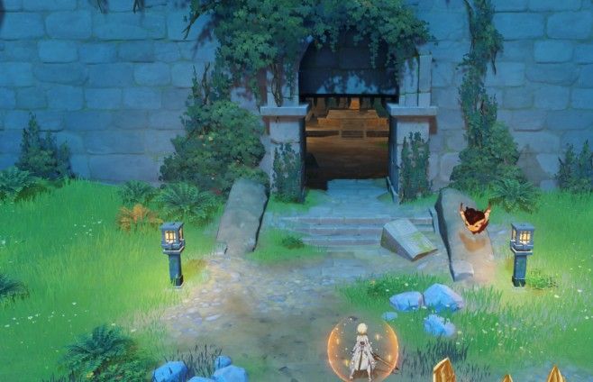将背包里的奇怪石头放到遗迹左右两边的雕像头部
