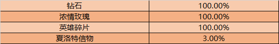 夏洛特的玫瑰宝箱概率:1%获得永久英雄夏洛特、10%获得夏洛特英雄体验卡,具体活动概率详情请见后续公告。