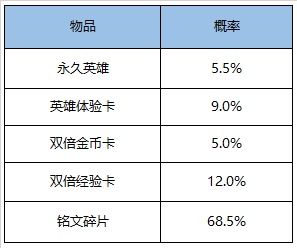 打开后可随机获得以下奖励之一:马超、蒙犽、米莱狄、英雄体验卡3天、双倍金币卡:1日、双倍经验卡:1日、188/138/108铭文碎片。