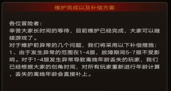 1、由于发生异常的范围在1-4服,对于1-4服发生异常导致离线年龄丢失的玩家,我们已经根据大家的创角时间,对所有玩家重新进行年龄计算,丢失的离线年龄会直接补上。