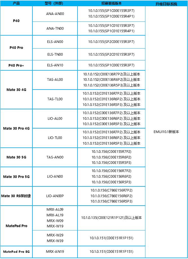 首批支持EMUI11的华为机型包括:华为P40 、P40 Pro、P40 Pro+、Mate 30 4G、Mate 30 Pro 4G、Mate 30 5G、Mate 30 Pro 5G 、Mate 30 RS保时捷设计、MatePad Pro 、MatePad Pro 5G。均为麒麟990和990 5G机型。