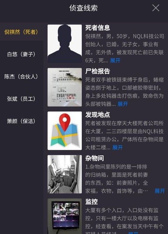2020年9月11日中午11:00,警方接到报案,称NQL科技公司创始人已失踪两天,经过8个小时的紧急搜查,在- -栋摩天大楼中一间不起眼的杂物间中发现了失踪多日的倪祺然的尸体,死者是NQL科技公司董事长,因涉及集团声誉,作案手法又极其残忍,故引起了媒体极大关注!尸体出现地点暂未发现凶手遗留线索,根据警方对现场的勘验,推断凶手极为熟悉此现场地形,目前警方已锁定了四名嫌疑人,考虑到案件性质恶劣调查时间紧迫,现号召全球推理侦探协助侦破此案...