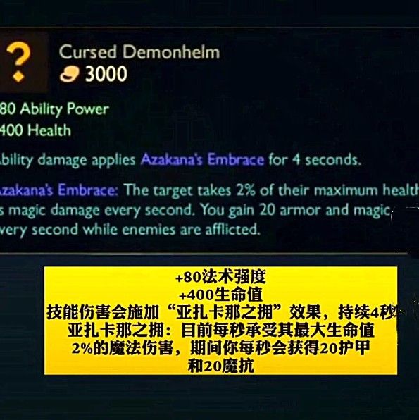 属性为:+80法术强度,+400生命值,技能伤害会增加“亚扎卡那之拥”效果,持续4秒。“亚扎卡那之拥”效果:目前每秒承受其最大生命值2%的魔法伤害,期间你每秒会获得20护甲和20魔抗。