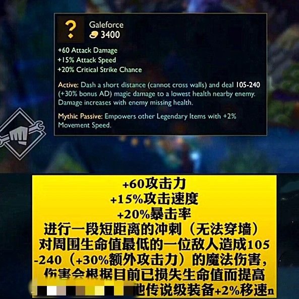 主动效果:把自己推出一段距离(不能穿墙)并对附近血量最低的敌人造成105-240+30%额外AD的伤害,带斩杀(敌方血越低伤害越高)