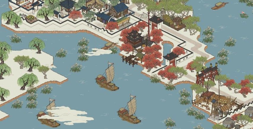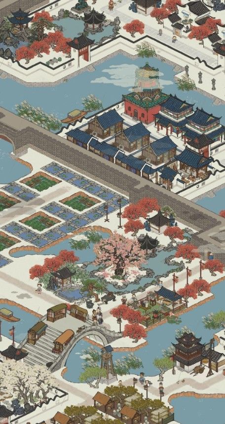 将驿站布置在码头边,围墙加红枫环绕。临近再依水建一座寺庙,一定要有钟楼。寒山寺本是邻水而建,除了寺庙本应在城西,奈何地图限制,只能修在城南,所以不算大问题。等级别再高些,加一座塔,就更好了!