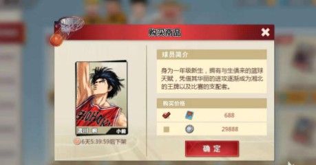 如果玩家比较心急不想再等7天的话,在商店中可以直接购买,购买方式有两种,一种是花费点券,一种是花费篮球币。点券只能通过充值来获得,而篮球币只能通过比赛和任务来得到。688点券或是29888点篮球币就可以直接购买流川枫。