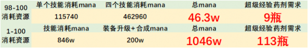 技能升级消耗mana846w,装备升级+装备合成200w,共1046Wmana。升级消耗超级经验药剂113瓶