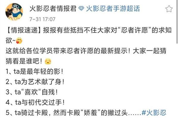 可能是最近很多玩家一直在问这个忍者阵容会是谁,官方也是忍不住放出了一些线索,这次同样是通过火影忍者情报君放出的,他没有明确说这五个忍者会是谁,只是提到了这五个忍者的一些线索,下面我们来逐个分析一下。