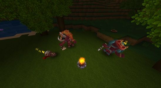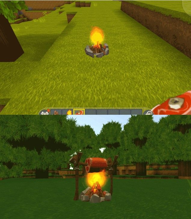首先我们来认识新道具:篝火,制作篝火非常简单,只需要果木和岩石块即可,篝火需要配合我们熟悉的生肉和火把使用。