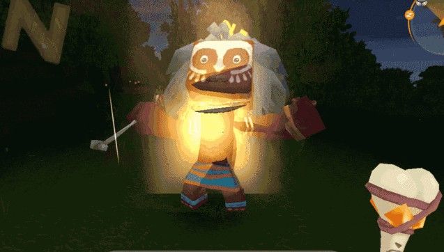 手持巫术骨锤点击一下正在睡觉的野人就会打掉野人的面具,从而驱散诅咒。