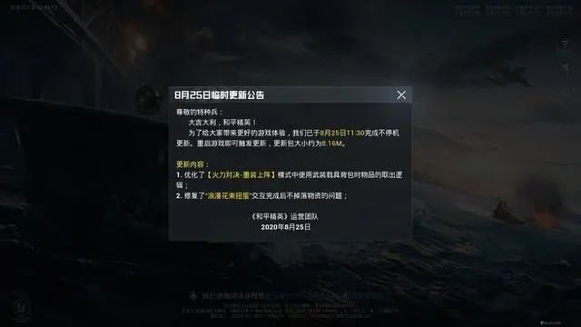 昨天登录和平精英的时候,发现光子又发布了一个更新公告,其主要更新内容为两个,第一个就是优化了火力对决-重装上阵模式中使用武装载具背包物品的取出逻辑,在这个模式下利用载具背包来无限复制物品的BUG给修复了,这个BUG从爆料出来到修复已经过了差不多一个星期的时间,这次光子的反应可真的有点迟钝了。