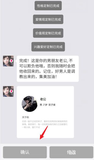 9、定制完成之后,有一次【修改】的机会,点击【确定】之后,就无法再次修改虚拟男友的信息;