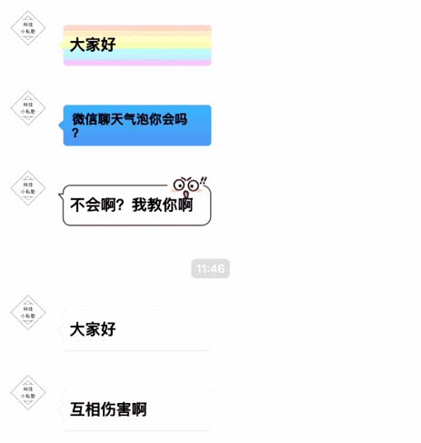 在下面的聊天记录中就可以看到具体的聊天气泡的具体显示效果啦!惊不惊喜意不意外?
