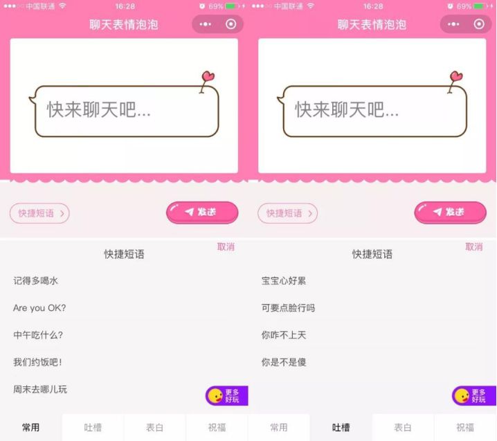 另外这个小程序还有一些快捷短语以及一些未解锁的聊天气泡,这些可以自己解锁了解。