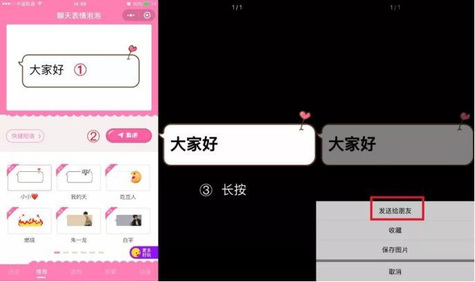 具体应用的办法也很简单,只要你选择你需要的样式气泡,在输入框中选择你想发送的文字与选择的样式,长时间按键,选择发送给朋友即可。