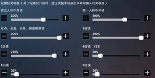 陀螺仪灵敏度:不开镜200% | 全息、红点、机瞄:300% | 2倍镜 300% | 3倍镜:270% | 4倍镜:50% | 6倍镜:36% | 8倍镜:30%