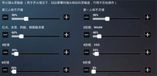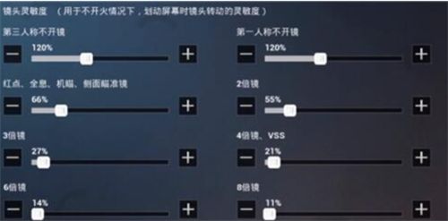 镜头灵敏度:不开镜120% | 全息、红点、机瞄:66% | 2倍镜 55% | 3倍镜:27% | 4倍镜:21% | 6倍镜:14% | 8倍镜:11%