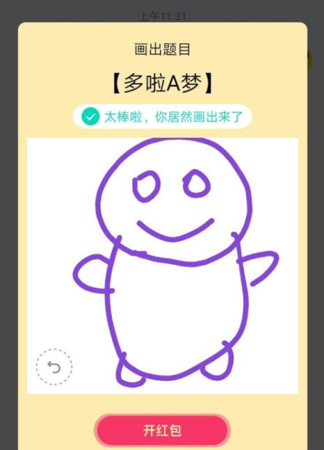 如果大家收到哆啦A梦的画图红包,打开画图红包,点击界面上的画笔。因为哆啦A梦是胖胖的,圆圆的,所以大家先画一个圆,当作哆啦A梦的脑袋,然后再画出胖胖的身体,再画上四肢,就行了,识别的时候可能会遇到问题,大家多试几次应该就可以了,主要就是哆啦A梦胖胖的身体。
