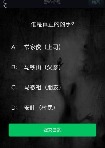 案件嫌疑人:常家俊(上司)、马铁山(父亲)、马敬祖(朋友)、安叶(村民)。