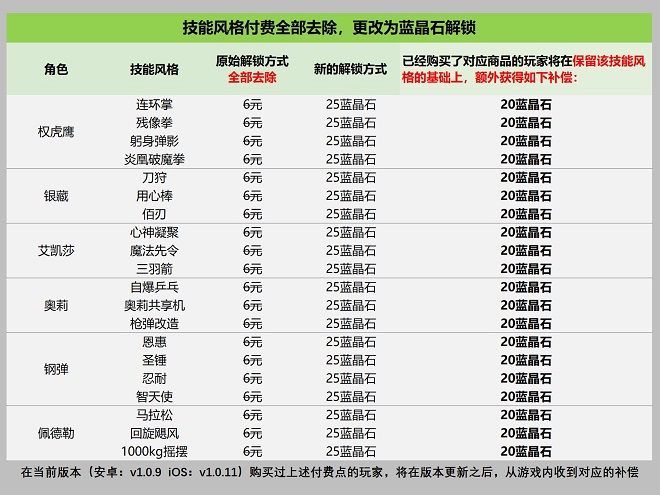 技能风格付费将在下个版本全部去除,更改为蓝晶石解锁(蓝晶石可以在战斗结算时获取)。