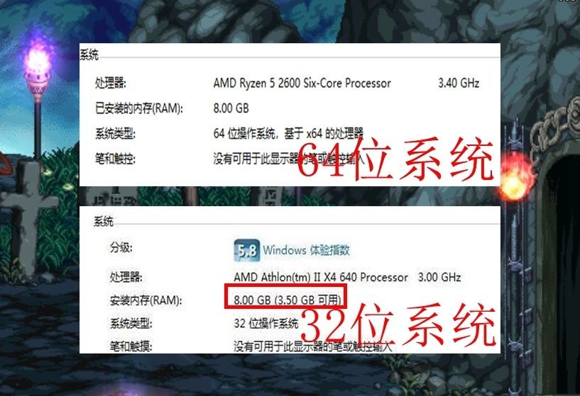 游戏中的打斗场面都是后台经过数据处理后展示给玩家的,其实程序后台要有很多工作要做,地下城作为一款贴图游戏,我们可以理解为会动的卡牌游戏,玩家的每一个指令程序在后台都会上传数据到服务器,然后服务器反馈给玩家电脑数据后游戏内的角色才会做出相应的反映,这一系列的动作都需要大量的图片数据和信息数据来传输,再加上地下城游戏内容越来越多,增加了大量的技能动画和其他效果,玩家在游戏中一般使用内存都会超过3G,而32位的程序只能访问4G的内存,加上系统占用的1G内存,4G的访问内存根本达不到玩家的需求。