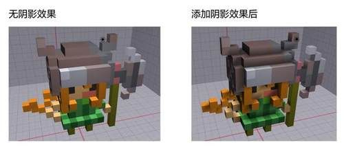 《迷你世界创造板》研发团队最开始采用的是白鹭引擎官方提供的平行光源进行灯光阴影处理,但是这种方式在游戏场景中有些不协调。在白鹭引擎技术团队的帮助及建议下,我们采用了 Ambient Occlusion 的技术,并将其进行进一步的简化,通过自定义顶点信息和自定义Shader,实现了完全不依赖于平行光实现了光影效果。具体的技术原理和效果预览如下所示: