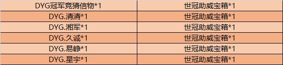 【世冠助威宝箱】: 打开后可获得以下奖励之一:铭文碎片*15、(坚韧/敏锐/掌控/沉稳/守护)团战精神回城特效(3日)*1。