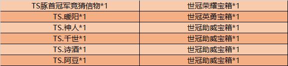 【TS世冠冠军纪念宝箱】: 打开后可获得以下奖励之一:铭文碎片*5、钻石*5、永久英雄/皮肤/1日体验卡(蒙恬、镜、马可波罗、盾山、张良、蒙恬-秩序猎龙将、镜-冰刃幻境、马可波罗-激情绿茵、盾山-极冰防御线、张良-一千零一夜)。