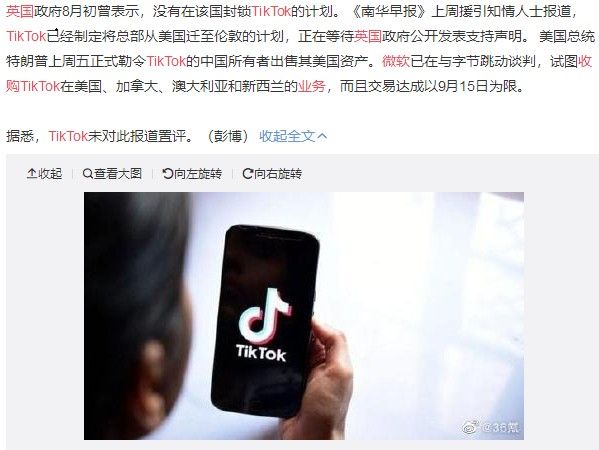 继微软打算收购抖音美国、新西兰、加拿大、澳大利亚四国业务消息之后,外媒报道称,微软还打算收购抖音在英国的业务。目前尚不清楚抖音的母公司字节跳动是否想要出售英国子公司,以及是否会有针对该业务的正式要约发出。