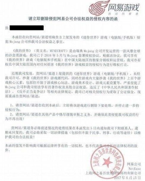 在维权函中,网易要求迷你玩立即下架《迷你世界》,停止进一步的侵权行为,并确保类似的行为不再出现。