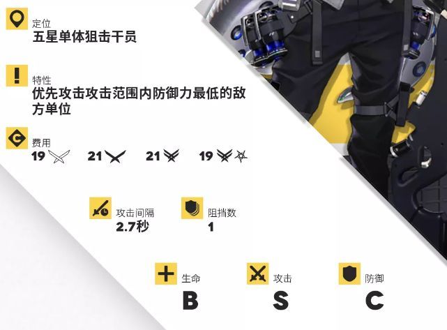 就在单体狙击干员分类中,安哲拉的血量属于中等,攻击力是T1的,不过对应的防御力相对其他干员会更低。面板方面也受到了特性的影响。整体来说还算是比较优秀的单体狙干员。