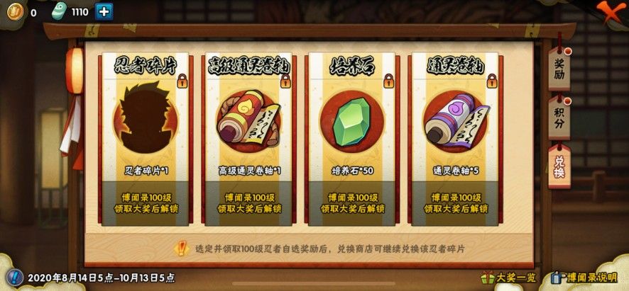 5、等级达到100级,且已选定井领取100级自选忍者碎片奖励后,兑换商店将开启该忍者的碎片兑换。【想好了再选,选谁以后就只能换谁】