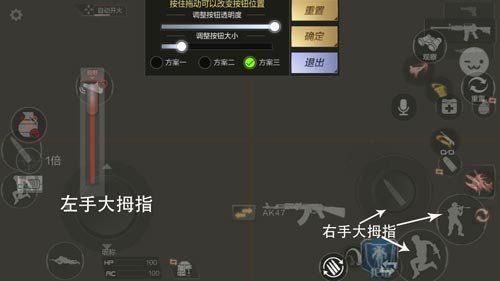 因为小编之前是和平精英的五指选手,所以对秒蹲情有独钟,秒蹲在FPS类游戏中躲避爆头线是非常有用的,因此多加了一根左手食指来控制蹲键,这个蹲键可以按照自己的操作习惯来进行大小缩放和位置移动。这里再讲一下为什么不像和平精英传统三指那样用左手食指来控制开火键,因为CF手游用点射的情况更多(AK远点),用右手大拇指可以有更快的手速以及更舒适的点击体验,而左手食指单点容易划动屏幕,点起来不方便。