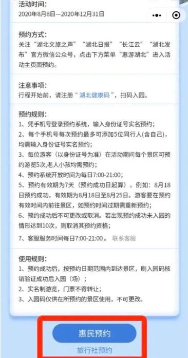 从2020年8月8日开始,一直持续到2020年年底,包括“十一”黄金周在内,湖北A级景区对全国人民免门票。全国疫情低风险地区游客,实名预约,测温、扫健康码后均可免门票进入景区。旅行社组团游客,同样也可以享受这个政策。