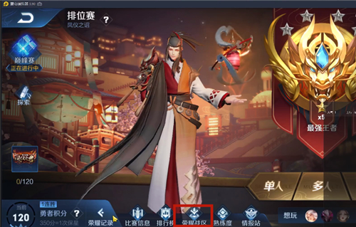 第二步:设置定位完毕之后,登录游戏,进入排位赛主界面,点击【荣耀战区】按钮。