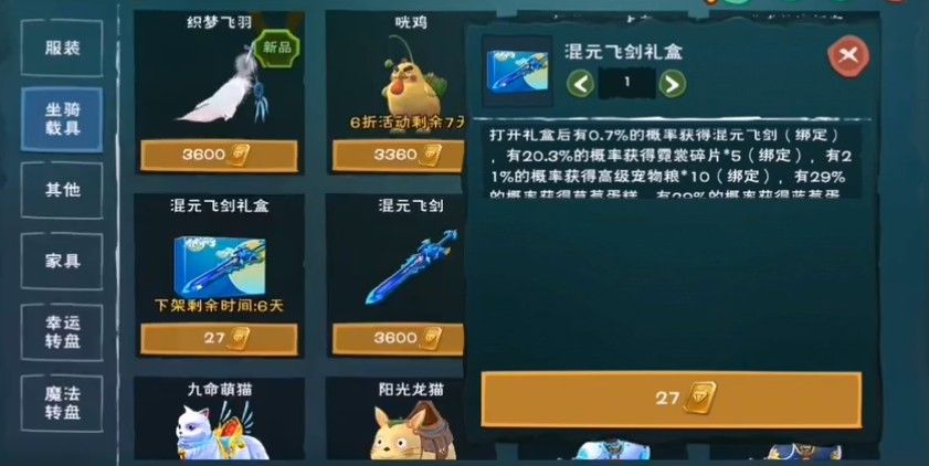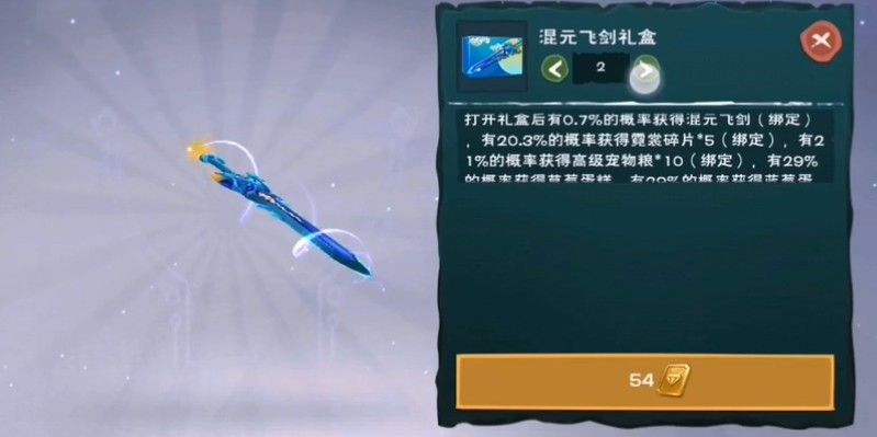 在混元飞剑上架期间,购入混元飞剑礼盒,打开礼盒后就有0.7%的概率获得混元飞剑(绑定)。