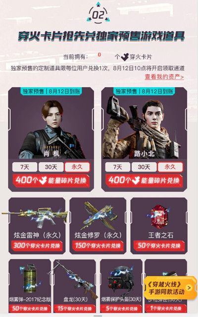 1肖枫(永久) ,总计2000份,需400个穿火卡片兑换,每位用户最多可兑换1次;