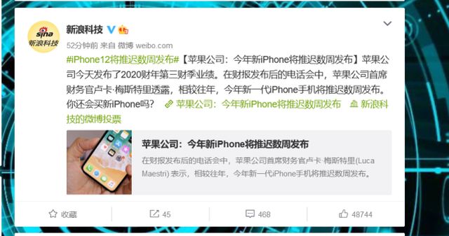值得一提的是,在财报发布后的电话会中,苹果公司首席财务官卢卡·梅斯特里(Luca Maestri) 表示,相较往年,今年新一代iPhone手机将推迟数周发布。
