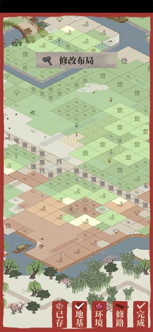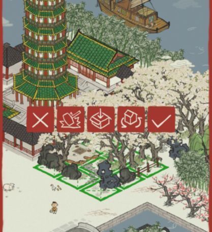 长按建筑进入改布局模式,点击建筑的五个符号分别是:取消、拆除建筑、放进仓库、旋转、完成(注意,有些建筑是不能放进仓库的)。应天府印——改布局也可以进入该模式。