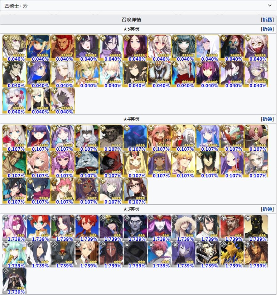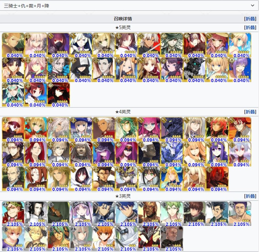 本次福袋是分为了两个,一个是包含了上三骑,也就是剑弓枪加上复仇者和裁决者,月癌与降临者的福袋,所有这些职阶的从者,包括四星和三星从者都在福袋内。然后是下四骑,也就是骑术杀狂和他人格的职阶福袋。下面是两个福袋的从者展示。
