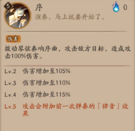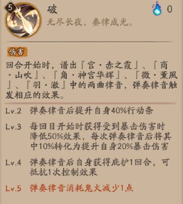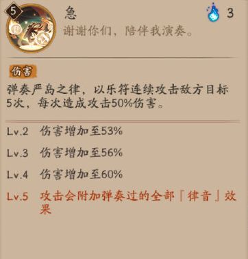 弹奏严岛之律,以乐符连续攻击敌方目标5次,每次造成攻击50%伤害。