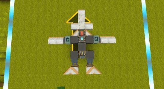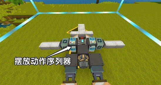 之后我们在驾驶座后面摆放无限引擎,并且在引擎两边安装转轴方块和机翼: