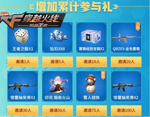 此次活动还有累计参与礼,小伙伴们,累计邀请人数到一定数量的时候,可以额外领取奖励,不仅有王者之骰,还有永久雪人挂饰,当然还有小伙伴们最喜欢的雷神抽奖劵,这些奖励可以说是白送的哦!能拿到什么道具,就要看小伙伴们的实力啦。赶快邀请你身边的好友参与游戏吧!