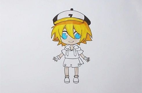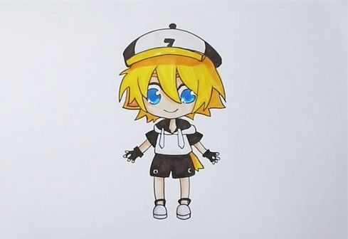 首先画出金的帽子,再来画头发,画出金的五官,眼睛大大的,嘴巴微笑着,接着画身体,上身穿着卫衣,下身穿着短裤,先给金的帽子涂黑色和白色,头发涂金黄色,眼睛涂蓝色,鞋子涂浅灰色,简单的凹凸世界金简笔画就完成啦!