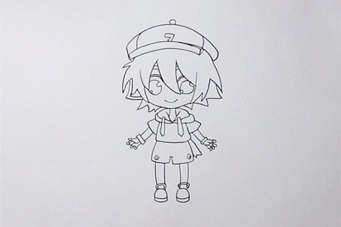 3、继续画出他的双手,双手张开,下身穿着短裤,双腿细长,注意画出鞋子,简单的人物线稿就完成啦!